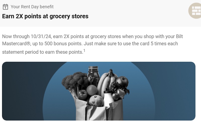 For the upcoming Bilt Rent Day benefits, bonus points with the Bilt Mastercard® start early this month – you can earn 2X points at grocery stores now through 10/31/24, up to 500 bonus points. You’ll continue to earn double points which is equivalent to 2x on groceries for double points benefit on the 1st of the month.