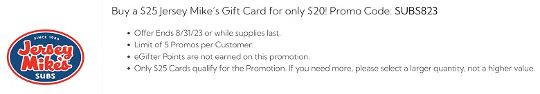 - Promotion: Buy a $25 Jersey Mike’s Gift Card for only $20! Promo Code: SUBS823