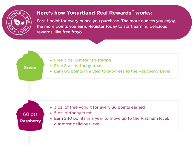 Sign up for the Yogurtland rewards program, Real Rewards today! You’ll get 3 oz. of frozen yogurt for free when you sign up and for your birthday! Additionally, you’ll earn 1 point per oz you purchase and if you move up to the Raspberry rewards level, you’ll enjoy another 3 oz. for free for every 36 points earned. Sign up for Yogurtland’s Real Rewards today. Check out more ways to Save Money with our Freebies and Free Food Deals here on HMB!